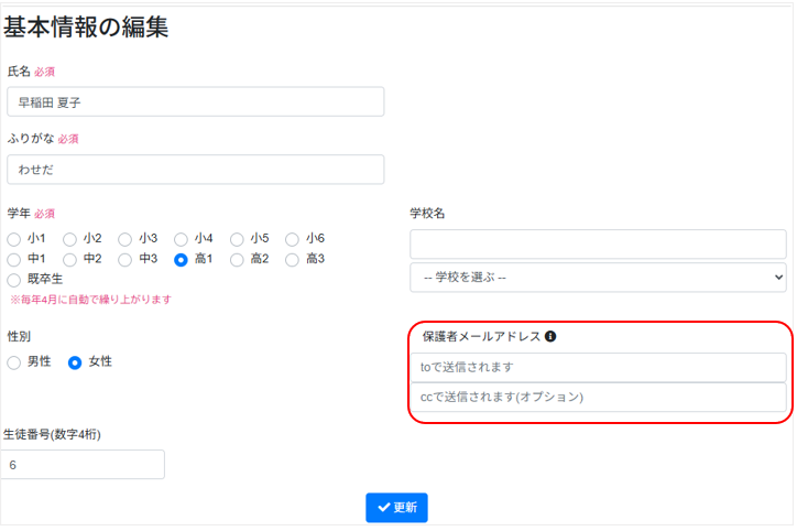 保護者メールアドレスは、生徒登録時に一緒に登録できます。生徒登録後、生徒台帳から編集も可能です。